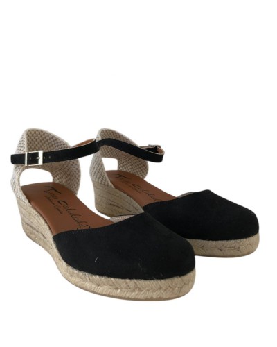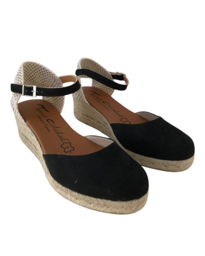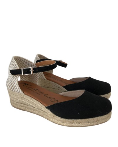 Este modelo cuenta con puntera cerrada, una elegante correa en el tobillo para un ajuste seguro y una cuña de 3.5 cm con plataforma de 1.5 cm, brindando altura sutil y estabilidad. Su fabricación en esparto garantiza durabilidad y un estilo versátil que se adapta a cualquier ocasión.