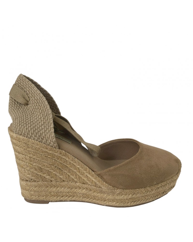 La alpargata Corina de esparto combina diseño tradicional y estilo actual. Fabricada en material textil, presenta cierre de cintas para atar al tobillo que asegura una sujeción firme y femenina. Incorpora cuña de 10 cm y plataforma frontal de 3 cm, lo que proporciona mayor comodidad y mejor reparto de la altura. La suela de yute trenzado aporta el acabado clásico característico, mientras que la plantilla acolchada favorece una pisada confortable. Ideal para looks de verano y ocasiones especiales.