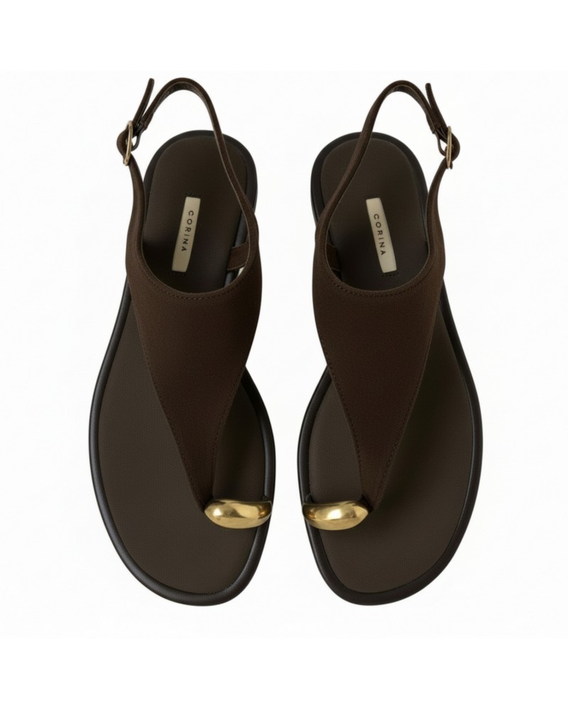 Elegancia y comodidad en cada paso. La sandalia plana tipo dedo de CORINA combina un diseño minimalista con un toque sofisticado gracias a su detalle de anilla metálica en el empeine. Perfecta para lucir en cualquier ocasión, desde un paseo por la ciudad hasta tus planes más casuales.