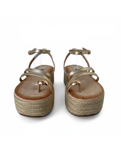 Sandalia con dedo anillado y plataforma de esparto de 5,5 cm, que combina estilo veraniego y comodidad. Su diseño natural y ligero aporta frescura a cualquier look, ideal para días soleados y ocasiones casuales.